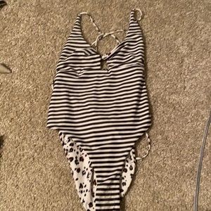 Swimsuit can be worn two different ways leopard print and black and white stripes I wore this maybe twice it’s in perfect condition size medium from PacSun