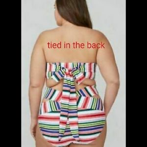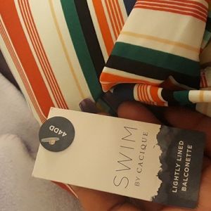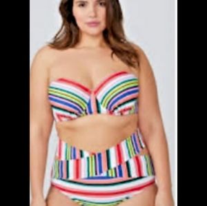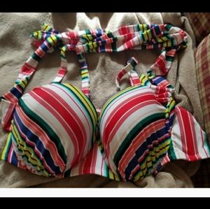 This swim top is a fully adjustable bra top style. Lightly lined balconette underwire with adjustable straps and a thick band in the back. Back has 5 hook and eye closures on the inside. Straps are fully removable for a bandeau style. Very structured.