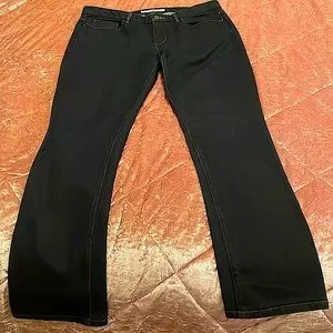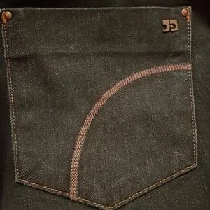 This is a navy blue Mulholland wash, cigarette cut jean in nearly new pre-owned condition. Only worn a few times. Slim, straight leg. Traditional pockets, front & back with brown stitching & brown/copper hardware.