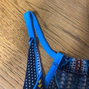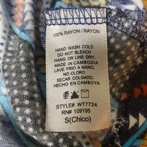 Love J size S tank top with colorful chevron and geometric patterning with semi-attached bust lining. Collar to hem 25”. Pit to pit 14.25”.