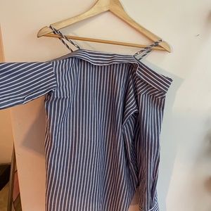Mango Off-shoulder poplin stripe shirt , long sleeve , textured blue-white-pink stripe , regular lenght