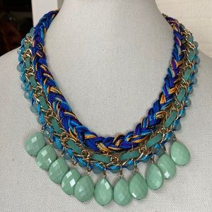 There is a layer of braided purple, blue and gold cord which is then hooked to a gold chain which has dark mint green leather weaved throughout with the edges of the chain having light blue beads again weaved next to it. Along the edge at the front of the necklace is a row of faceted mint green tear drop beads. This is a fun and stunning piece which would be fun to wear with any outfit as it is so unique.