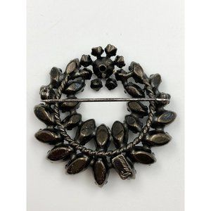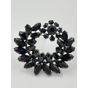 Beautiful Sherman Brooch with black/jet prong set swarovski crystals with ruthenium plating on back of brooch (japanned), in excellent condition. Very Lovely brilliance. 24 faceted Marquis crystals in a wreath shape with 8 round faceted crystals and one larger faceted round crystal in centre in a floral shape as focal point of brooch. Made between 1949-1980 in Montreal, Quebec by Gustav Sherman. Roll over clasp in great working order. No returns or exchanges.