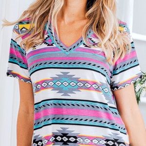 SHORT SLEEVE V NECK AZTEC PRINT TOP