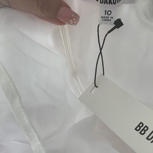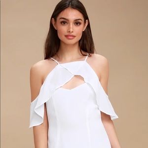 No matter the occasion, the BB Dakota Kaless White Off-the-Shoulder Dress is always on the guest list! Airy, crepe fabric shapes a cutout, halter neckline, that leads into ruffled, off-the-shoulder sleeves, and a relaxed bodice. Flirty sheath skirt. Hidden back zipper/clasp.