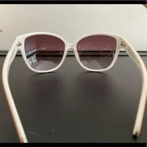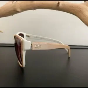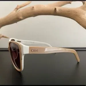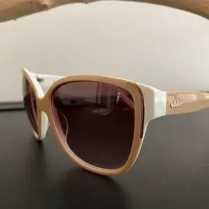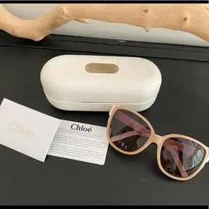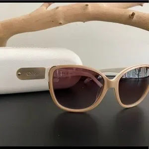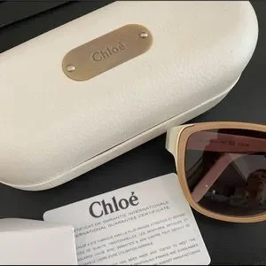 Tan and cream resin Chloe sunglasses with gradient lenses. 37393. Great condition with slight scratching on lenses. Height 2.25” width 6”. Case and authenticity card included