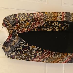 Dramatic colors of red, mustard, navy & sand in a stunning print on this flowing open sided wrap!
