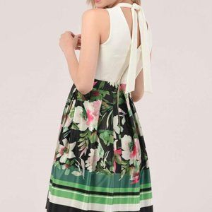 Details: V- back, 2 in 1 skater dress, Tied back neckline, Floral print skirt, Inner lining stitched, Waistband