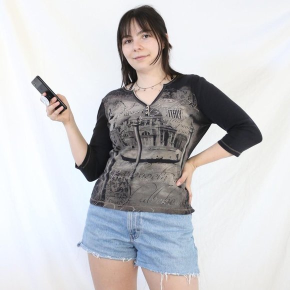 Black quarter sleeve top with y2k brown Italy graphic on the front! Has "Venice" bedazzled on the front with a button up V neck. From the vintage brand Blue Canyon, made in USA! Size Large.