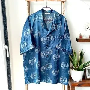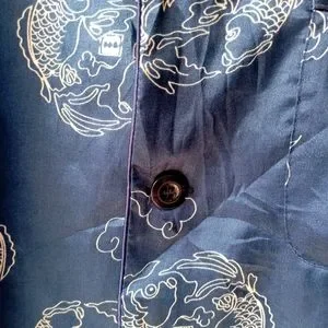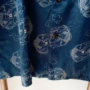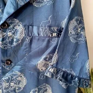 Soft silky top with auspicious carp symbol print in navy blue and white. Button closure on front and classic collar. Short sleeves. Bought in China for QiGong practice. Size L to XL. Perfect condition. For more measurements, feel free to ask in the comment section below.