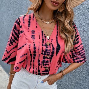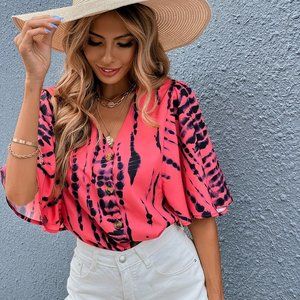 New Tie Dye Butterfly Sleeve Button Through Blouse Pink