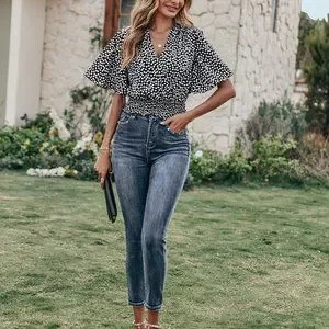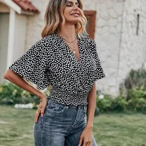 New Ditsy Floral Print Butterfly Sleeve Blouse black and white