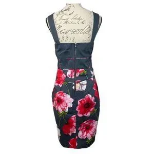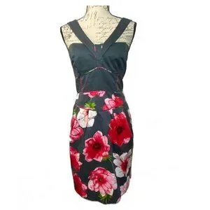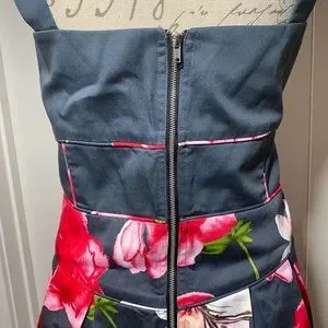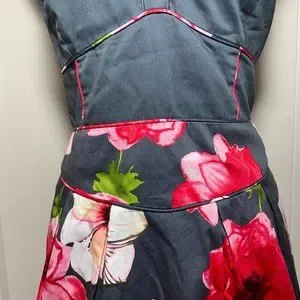 Anthropologie Sine Hollyhock Floral Dress Size 12. Knee length pleated skirt in vibrant colored flowers with a fitted empire style bodice midsection decorated in a piping trim. Soft stitched cups with almost halter style tank straps. Exposed back zipper. Fully lined 2 front side pockets. Cotton blend