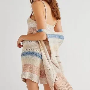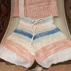 Bohemian Cool In Crochet, this Essential Sweater Set Features a Timeless Cropped Tank with matching Highrise Longline Shorts with a slightly Flared Bottom and coordinating Sweater Vest to tie it all together for a great Done-In-One Look for any Occasion