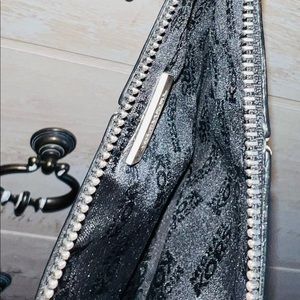 Michael Kors Black Leather Vintage Embossed Silver Button Wristlet in excellent condition. Has beautiful metal grommets with detailed stitching throughout and strong, attachable lobster claw strap to adhere to your purse or belt buckle or just hang on your arm or carry in your hand. Enough room for a cellphone and/or makeup. Great for nightclub or beach. Very collectible design from Michael Kors. Measures 6.5” 4”. Wristlet strap length is 16”. Limited Mother’s Day Special!