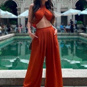 Boho 2 Piece Tie Front Tube Top & Pleated Wide Leg Pants Set burnt orange
