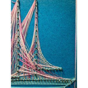 Vintage String Thread Art Sailing Ship 1970's Nail Blue Boat Felt Wood Backing