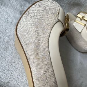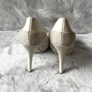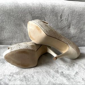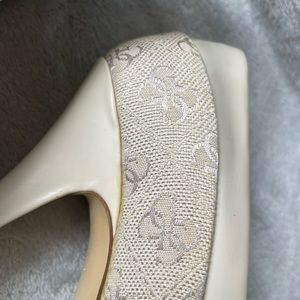 Beautiful pair of GUESS stilettos. The upper material is a combination of beige faux patent leather and fabric. Gold tone inside and hardware on the front.
