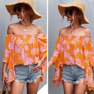 Orange Floral Smocked Bell Sleeve Off-Shoulder Top