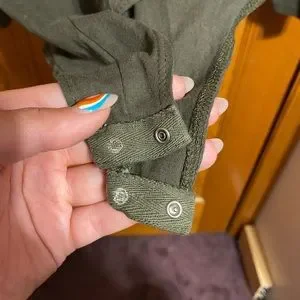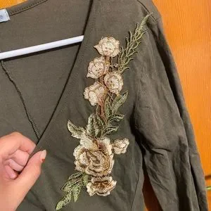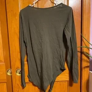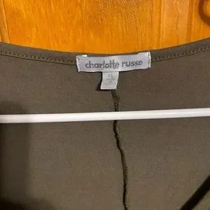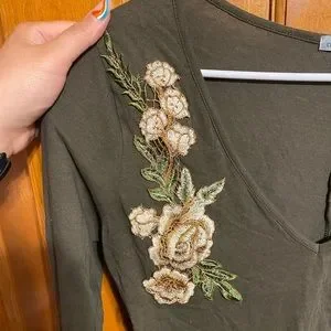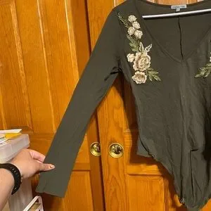 Charlotte Russe long sleeve bodysuit size XL. Has beautiful floral details on the chest. Olive/evergreen color. Has one set of the snaps missing but does not effect functionality. Open to other offers!