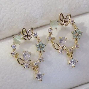 NEW 14K Gold Plated Diamond Flower Butterfly Circle Earrings
