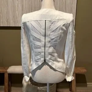 Hidden Zippers at sleeves. Window pane cut out back with zipper. Shoulder pads.