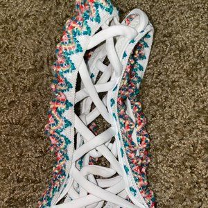 Top: Asymmetrical features lace up shoulder in the back and shoulder with multicolored scalloped edge.