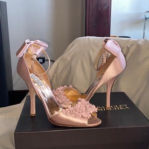 Badgley Mischka blush pink heels, with a bow on the back and ruffles on the tip of the heels with a rose gold sole.