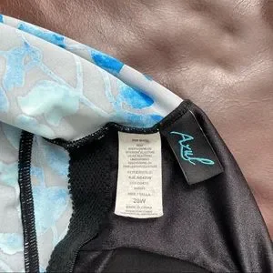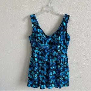 Pretty navy and white floral print. This cute little suit offers full coverage and modesty while still looking cute. The empire waist and flirty skirt creates a flattering silhouette for many figures