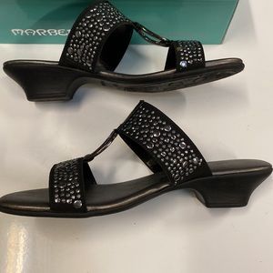 Marbella black and silver sandals with low kitten heel. Shoes have been gently used and are in great condition. Size 6.