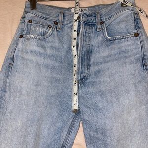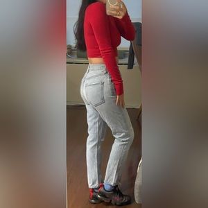 In excellent condition! I love 💗 these jeans, they are so flattering, but I outgrew 🙃 i included some photos of how it looked when it used to fit. I don’t remember the name but it fits and looks like the Riley jean in the color shatter, this item was purchased from Aritzia. Aritzia Tna red cropped ribbed long sleeve tshirt in size xxs available in a separate listing.