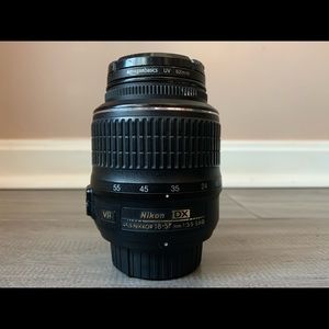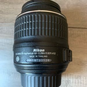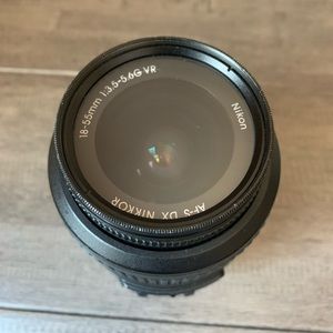 Standard Nikkor 18-55mm lens. Used quite a lot (favorite lens) so there are some minor signs of wear and tear but the lens is functioning exceptionally well. No fungus, no cracks, comes with protective lens filter, lens cap, generic (non-Nikon) lens hood, and original lens pouch. Has both M and A modes, and VR option.