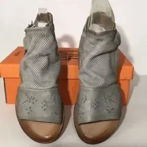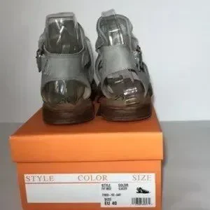 European leather upper, perforated front with moldable wiring, stud detailing, adjustable ankle strap with buckle closure