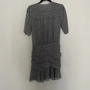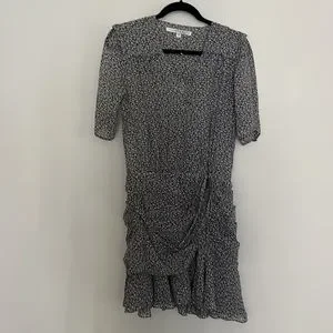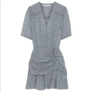 Beautiful Veronica Beard mini dress in great condition. Crafted from printed silk-chiffon, this dress has a semi sheer wrap-effect bodice and cleverly placed gathers at the skirt. Concealed snap closure at font, concealed hook and zip fastening at front