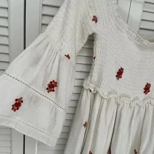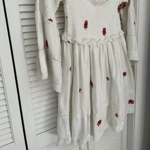 GUC, some minor wear on fabric and pilling from washing as it’s a soft cotton feeling material. No size tag, but it’s a small. Very high quality weight dress and adorable accents. Floral design is a burnt orange and red combination with peplum bell sleeves and tiered skirt. Feel free to make an offer!