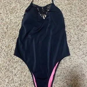 PINK brand black one piece. Adorable woven front, not complete full coverage for the bottom, open back that begins just above the butt