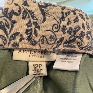 These sage green pants will work great for summer and take you into fall. The back band is subtle, wide elastic (see pics). They are a medium weight cotton with a little stretch and are in great condition!