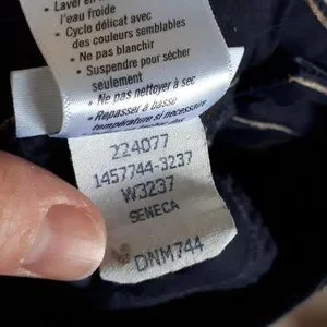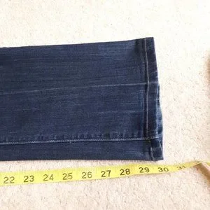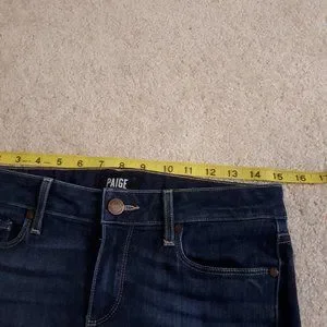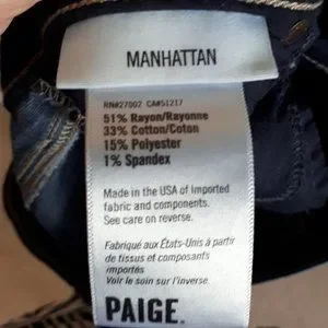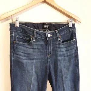 Dark to medium wash blue in colour (actual colour name is "Seneca" wash). Mid-rise. Bootcut leg opening. Some whiskering and slight distressing. Classic 5 pocket design. Zipper and button closure. Good amount of stretch; 51% rayon, 33% cotton, 15% polyester, 1% spandex. Machine washable. Made in USA. Paige style number: 1457744-3237
