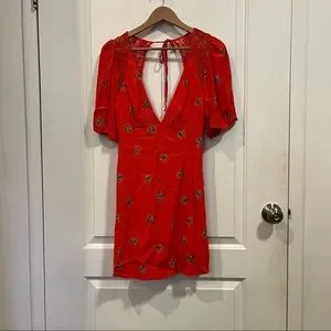 The Free People Mockingbird Coral Red Floral Print Backless Mini Dress is here to add a sweet pop of color to your closet! Bold coral red woven fabric, with a dainty teal and beige floral print, shapes this flirty little dress with a plunging V-neck, fluttering short sleeves, and sheer, embroidered mesh accents along the shoulders and tying open back. Seamed detailing creates a babydoll waist and travels along the flaring mini skirt. Hidden side zipper.