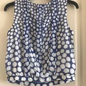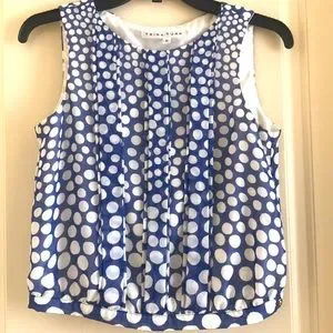 Fun Trina Turk sleeveless polka dot top. Slips overhead fastens with one button on banded waist. Fully lined. Relaxed fit so hides the flaws. Pair with A line skirt or jeans. So chic and fun!