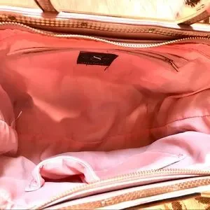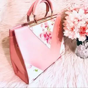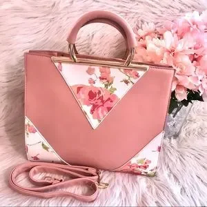 Pretty and feminine Pink/mauve and floral handbag. Has removable, adjustable shoulder strap, zip top closure, round handles and rose gold hardware. The exterior has a back zipper pocket and the interior has a zipper pocket and 2 slip pockets. Measurements: 13” width, 11-1/2” height, 4” depth and 4” handle drop. In great condition. No marks or scratches on the exterior, the inside has a few small pen marks by the zipper pocket as seen in interior photo.