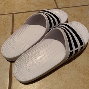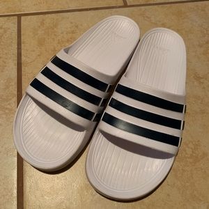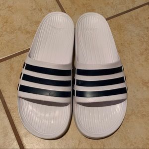 White adidas slides with black and white stripes. Worn once, super comfortable perfect for the summertime!