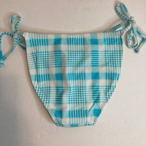 Xhilaration brand string bikini bottom (only) - side ties. Cheeky bottom in a white and turquoise plaid. Size XS (00) is 9 inches across the top of the back from tie to tie. Size M (4-6) is 11 inches across the top of the back from tie to tie. Smoke and pet free environment. Please let me know if questions - glad to answer!