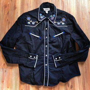Tags: western rodeo cowboy top rancher top embroidery embroidered top vintage western top rodeo top cowgirl top cowboy top county fair horse show 4h rural Texas Wyoming Montana Nevada Utah western ranch top out west Wild West top rancher top xl western top black western top country singer vibes boot barn cavender's