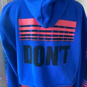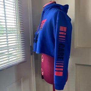 Amnesia women electric blue graphic long sleeve hooded, raw cut lower hemline detailing, pullover crop top. Size M. Good used condition.