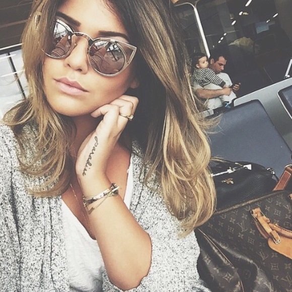 Modern meets retro in these laser cut cat eye sunglasses. Round lenses, pointed cut out cat eye frames. Gold frames with pink mirrored lenses. Available in several colors.