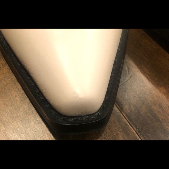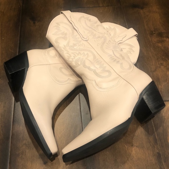 JEFFREY CAMPBELL Dagget Boot Natural NWOT or box; store display shoes whit minimal signs of wear especially on soles and heels , and light handling marks/scratches from customers or storage-as posted-please check all the pics carefully and ask questions before purchasing! SOLD AS!!! Sizes 7 & 8,5 -true to size-Mid-calf western heeled boot.