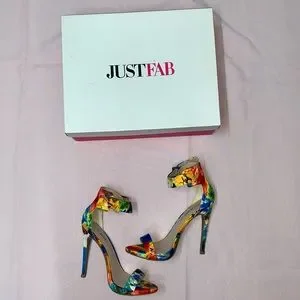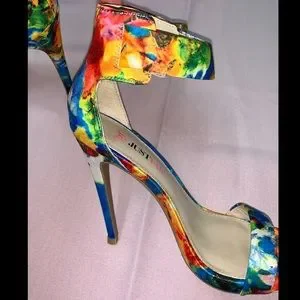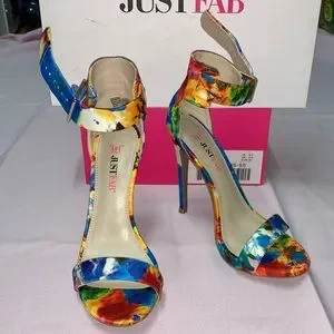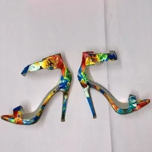 Women’s size 5.5 bright multi colored high heels. These high heels are basically new. They are in perfect lightly used condition. These heels are originally bought from just fab and do come with the original box as shown in photos above. These high heels are stunning and have adjustable ankle straps for desired fit as shown above. Heel height is approximately 4.5 inches. These are truly a one of a kind pair and the photos don’t do these heels justice! 👠😍🦋🌈🌞🌺