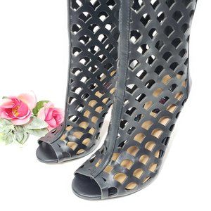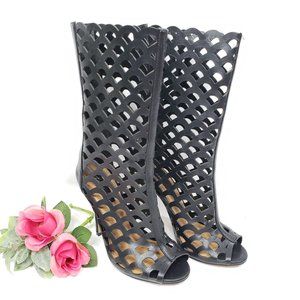 New HeartSoul Lattice Cut Open Toe black boots with heel & scallop edge. Faux leather. Zip back. Sits at calf. New condition - try on only. Size 7.5.