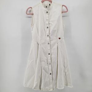 in great condition size extra small. bust 18 waist 15 pit to hem 26 You´re ready for the summer wearing this Britsum Slim Flare Fringe Dress. A feminine dress executed in a soft touch denim fabric, will make you look your absolute best. A small raised neck and the flairy skirt add femininity to this style. Slim Fit. Above the knee. Small raised neck. Partial raw edges along bottom hem. Heart shaped decoration at waist. Button closure. This tightly woven right hand construction has clean, yet authentic looking twill lines due to the innovative spinning technique. The Kana White Denim looks fresh and stylish and has an exceptional surface as well as an extraordinary touch. All in all, a perfect summer material!